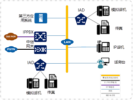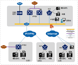 对于用户容量较大且分支机构具有本地再生需求的政企用户,可以采用分布式部署组网。主系统集中部署在用户机房,正常情况下所有的终端用户集中注册到中心节点。在分支部署小容量IPPBX,实现本地出局和本地再生。对于不需要本地出局的分支,可部署IAD/IP话机等方式。场景多用于大中型企业/政府/金融/部队/教育/医疗/酒店/电力/石化等行业用户。